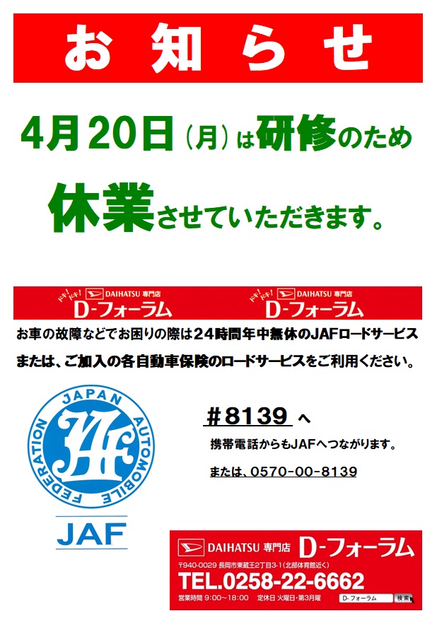 4/20(月) 研修のため、お休みを頂きます。 ご迷惑をお掛けしますが何卒よろしくお願いします。